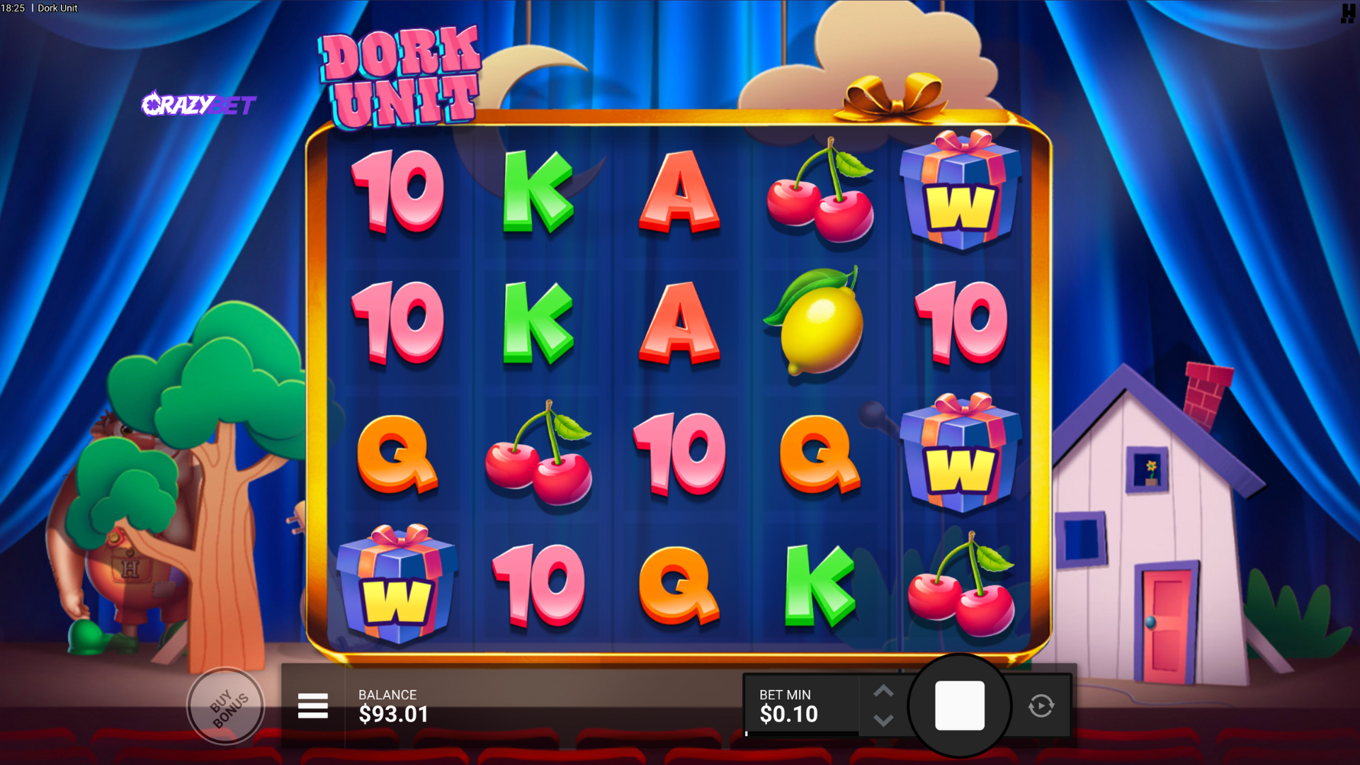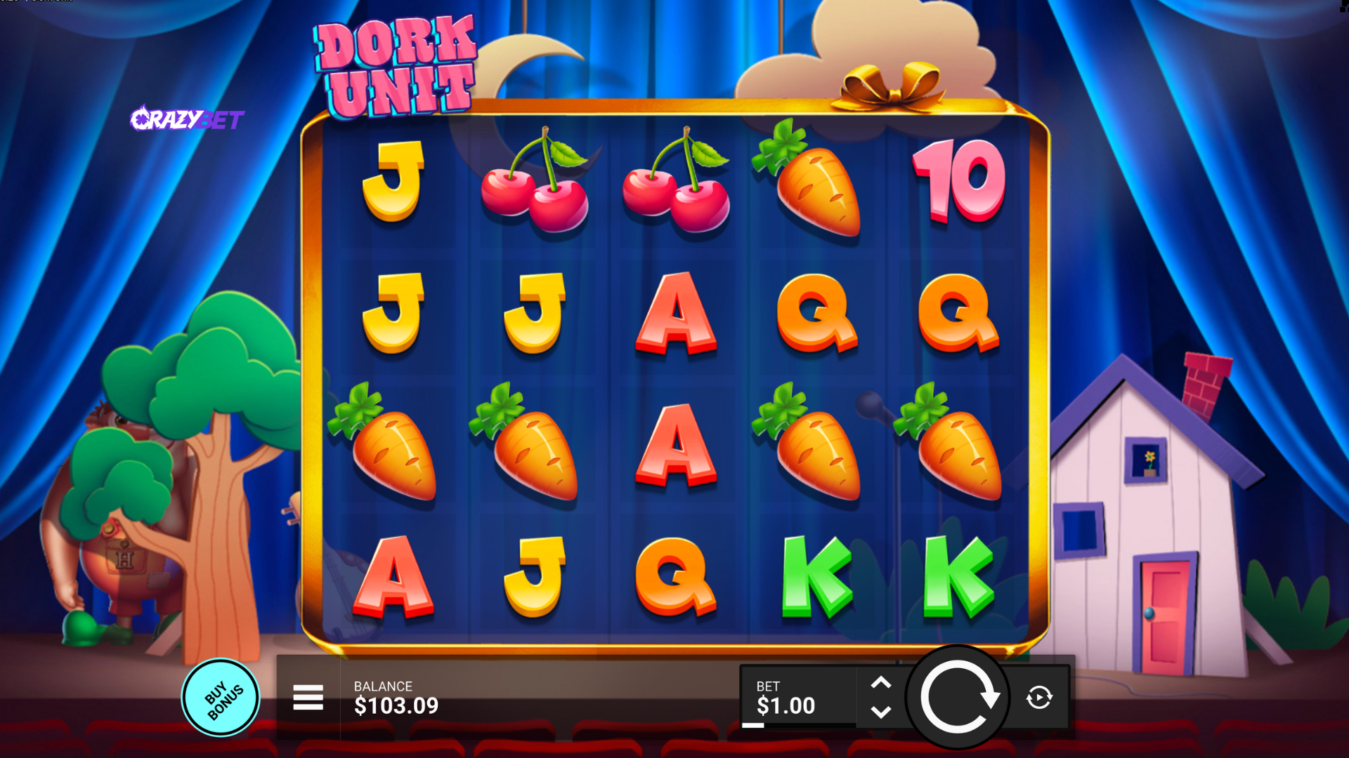 Dork Unit Opening Screen: 5x4 reels, fruit and letter symbols, $1 bet size, CrazyBet stage-themed backdrop