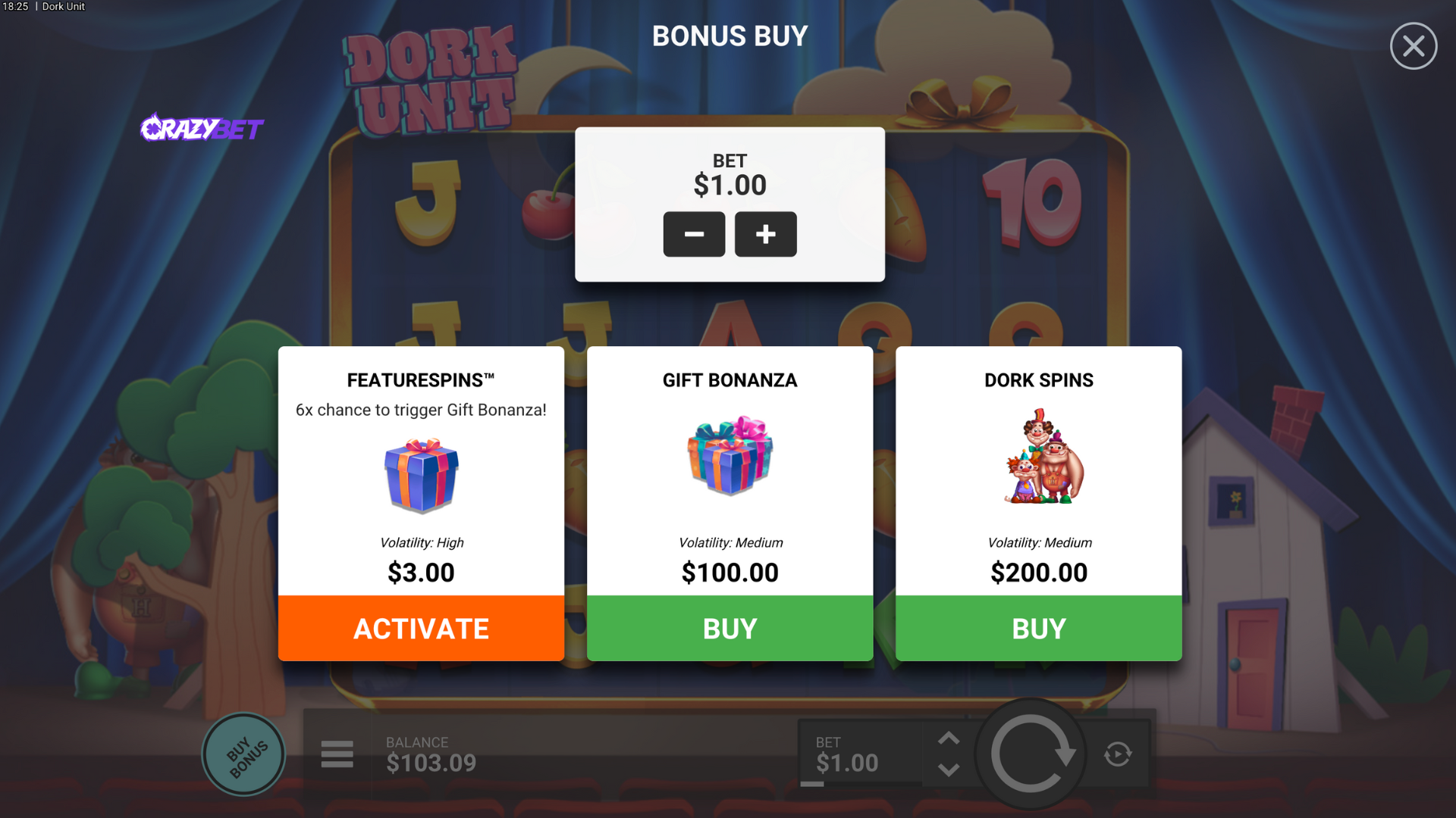 Bonus Buy screen: FeatureSpins 6× chance of Gift Bonanza ($3), Gift Bonanza buy ($100), and Dork Spins bonus buy.
