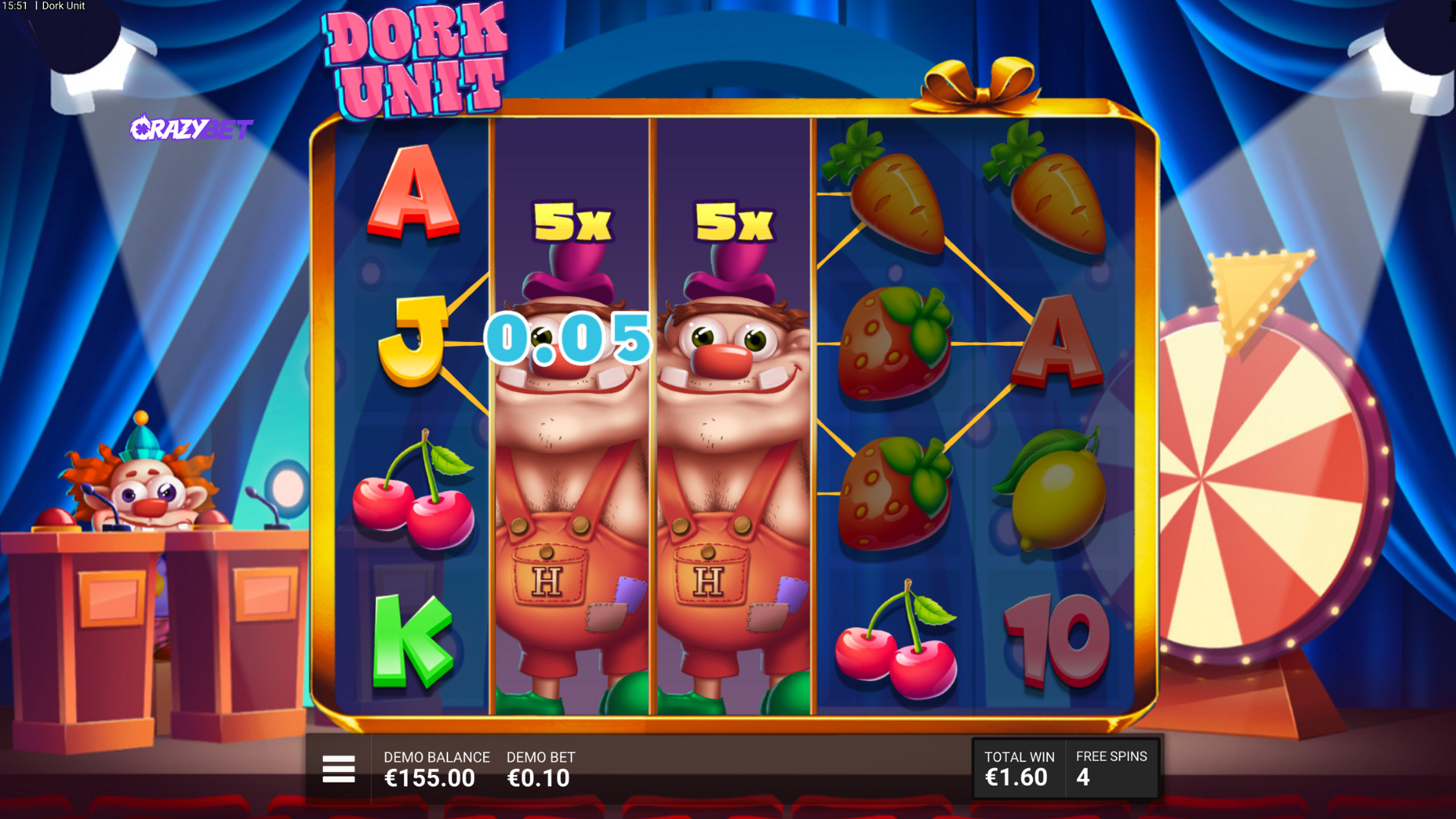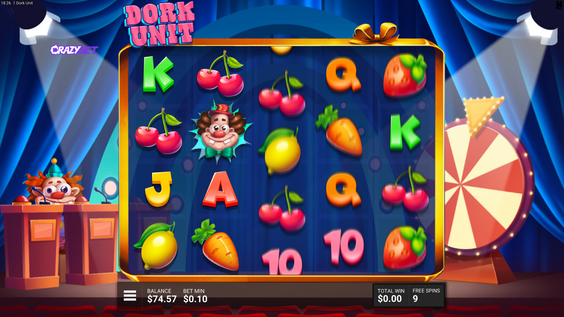 Start of Dork Spins on Dork Unit: lit-up stage, wheel on the right, 9 free spins with special clown features