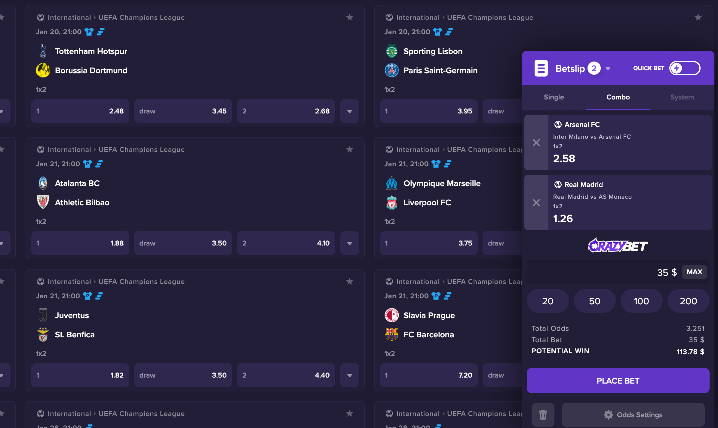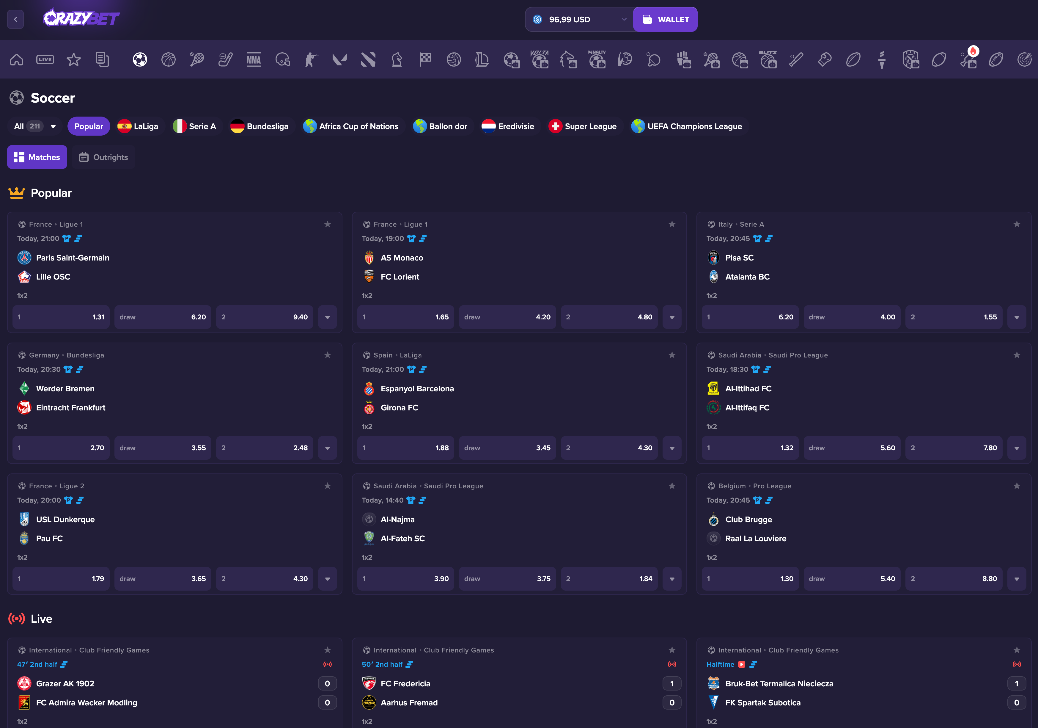 Betting on football matches at Crazybet is straightforward. You create your account, get it verified, deposit funds by bank card, bank transfer or cryptocurrency, and then choose the matches and markets that fit your style and risk tolerance.