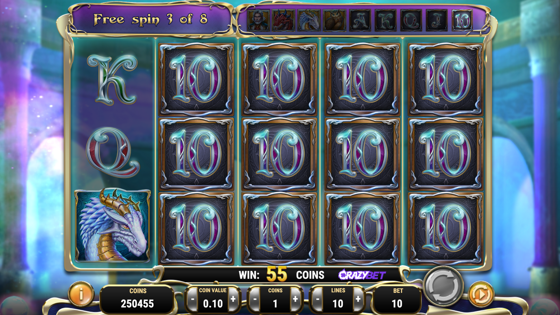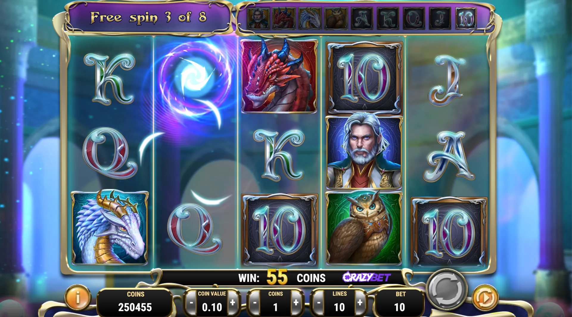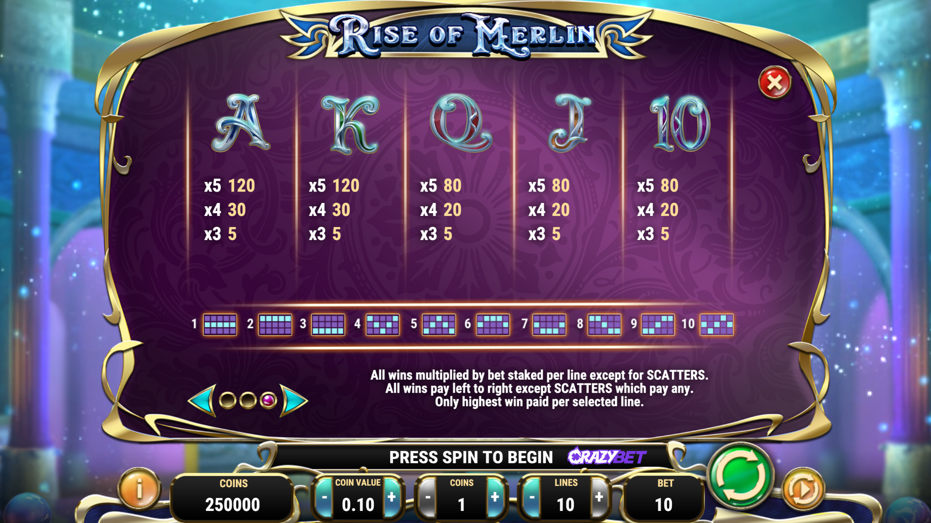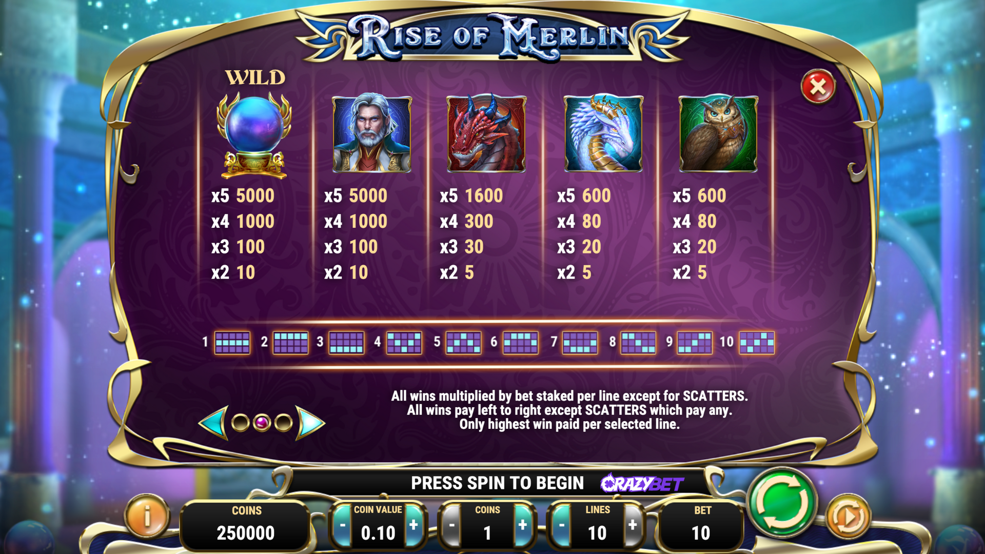 Rise of Merlin uses a classic 5x3 grid with 10 adjustable paylines. We strongly recommend always playing with all 10 lines activated - we missed out on a 340€ bonus by playing only 5 lines!