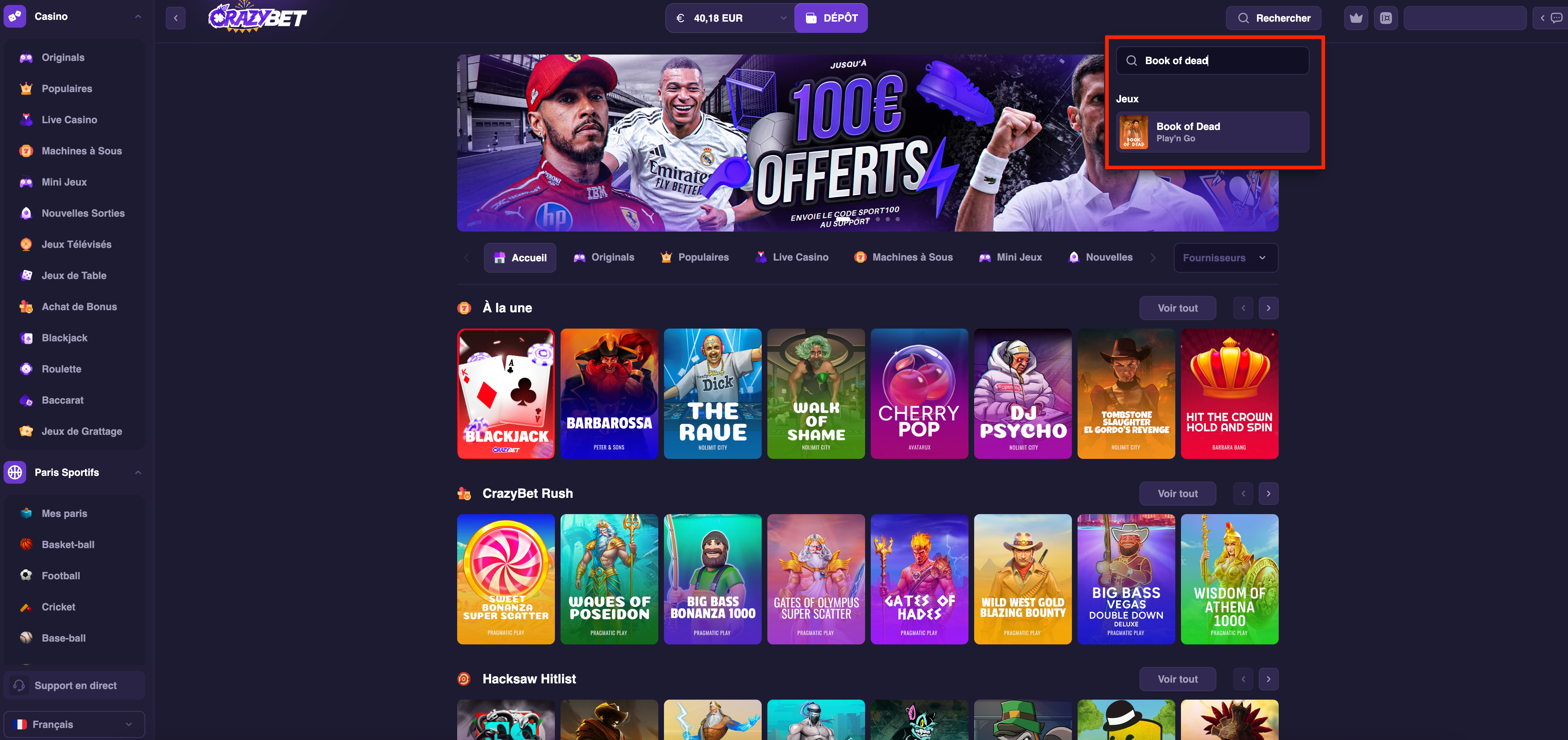 Capture of the CrazyBet lobby: the search bar displays “Book of Dead” (Play’n Go) to quickly access the game in demo or real money mode.