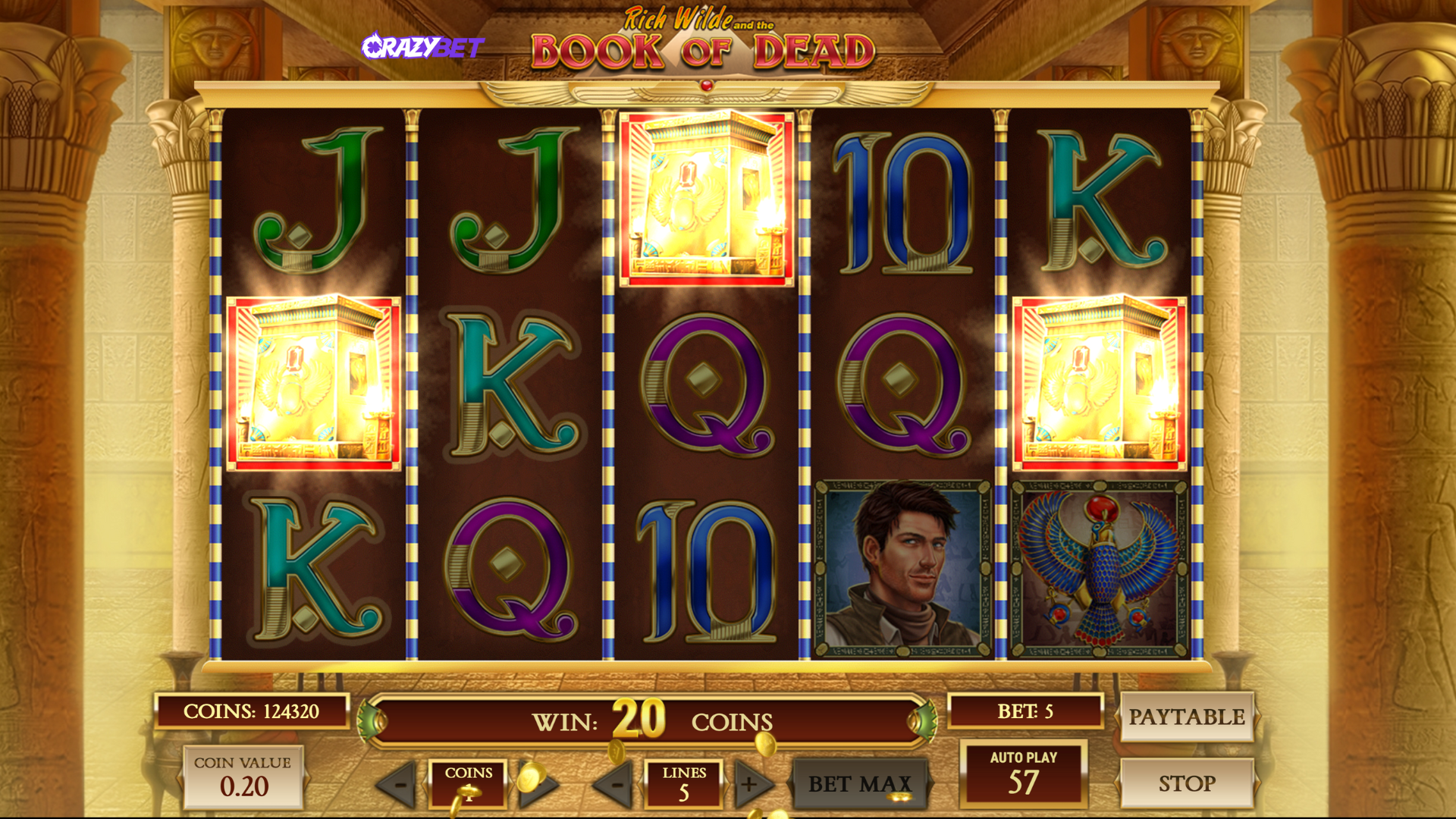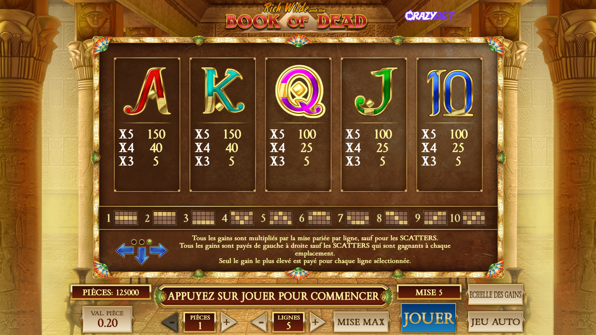 Capture of the base game of the Book of Dead (Play’n Go) slot machine on CrazyBet: 5 reels, 10 lines, Rich Wilde, pharaoh, scarab symbols and A-K-Q-J-10 values.