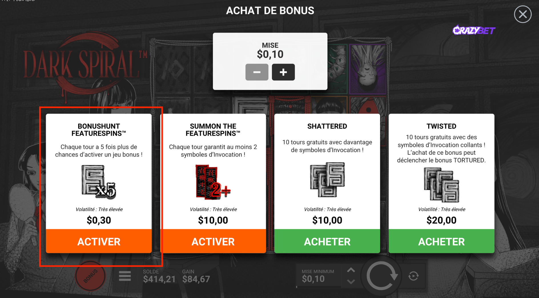 Dark Spiral offers four different bonus buy options, each with slightly different RTP values depending on the mode — a level of transparency that’s fairly rare from Hacksaw Gaming. All buy options come with an RTP higher than the base game.