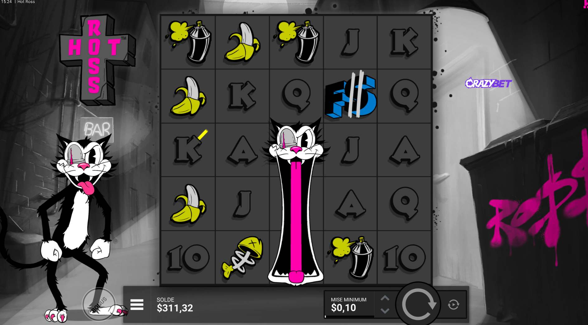 Hot Ro$$ grid showing the “W” Bomb Wild and colourful character symbol, $0.10 minimum stake selected and $311.52 balance displayed.