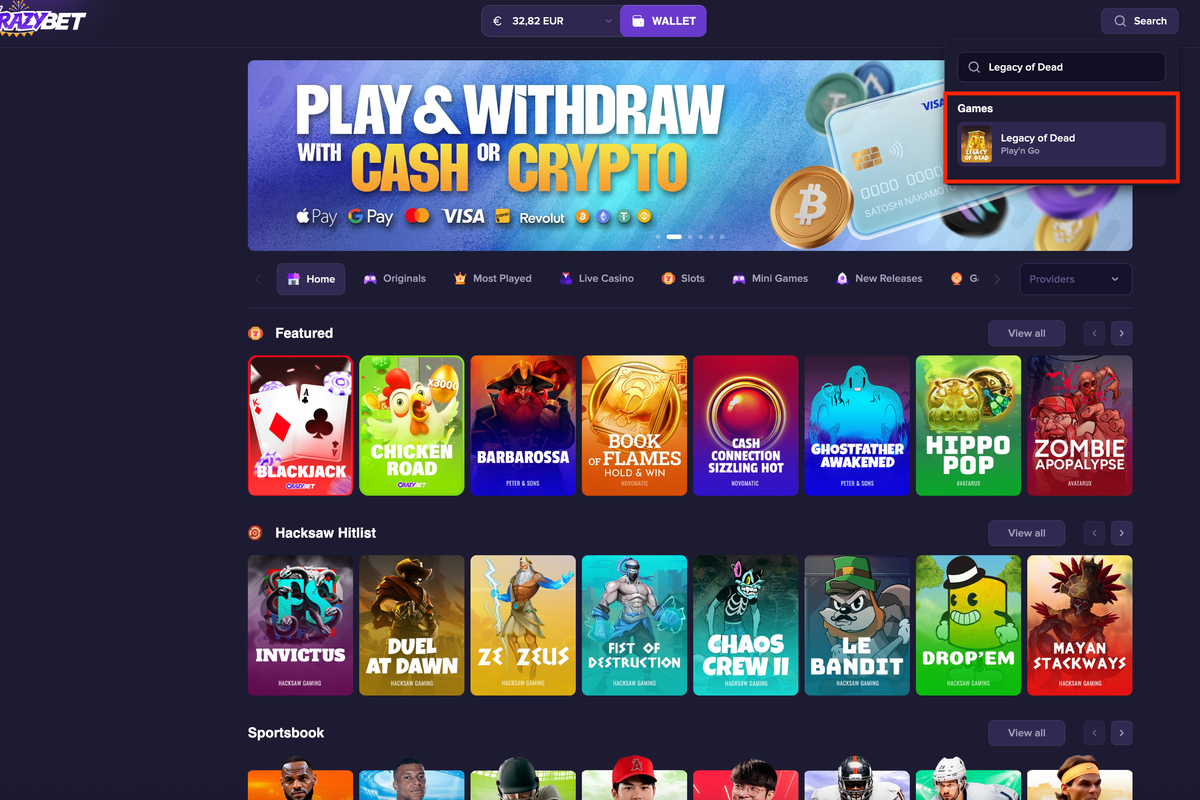 Crazybet screenshot: the search bar displays “Legacy of Dead” with the Play’n GO game thumbnail. A practical example of how to find the slot from the homepage (Slots category, providers, navigation visible).