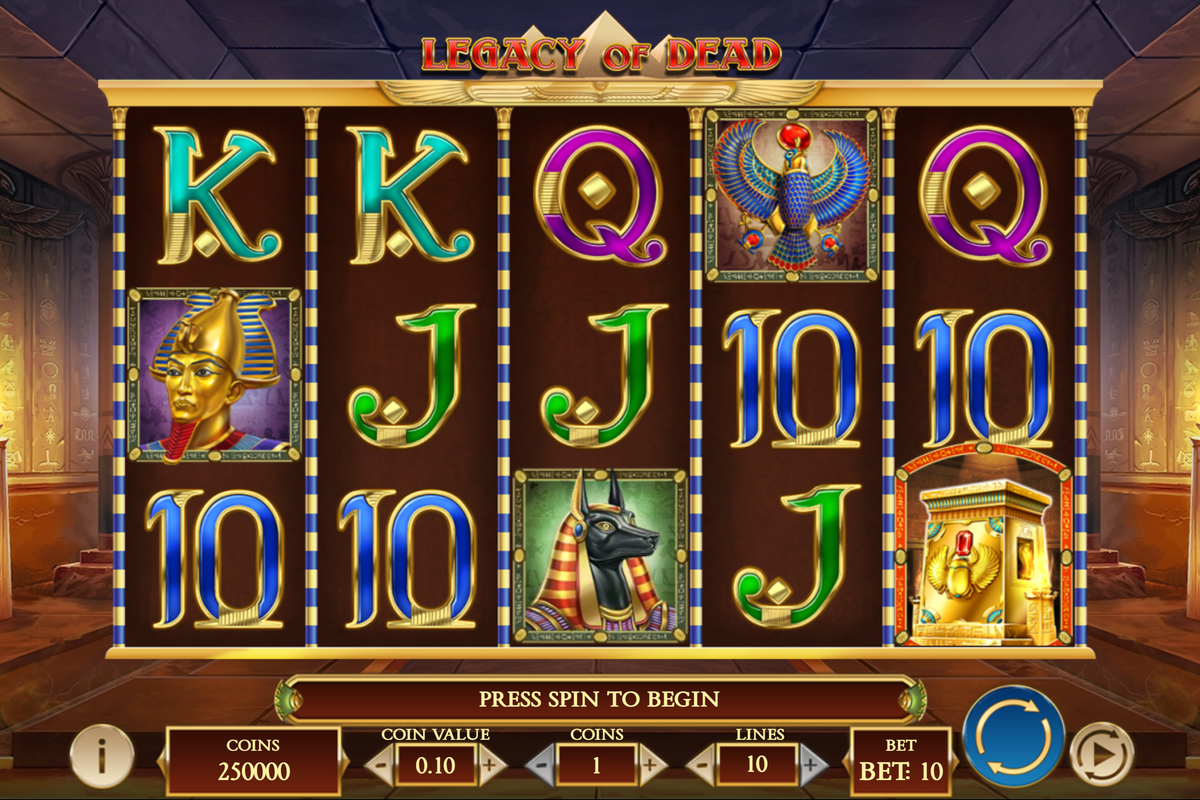 Legacy of Dead interface screenshot (Play’n GO): 5x3 grid with 10 paylines, showing bet and line settings. Base game illustration, Ancient Egypt theme, and betting configuration