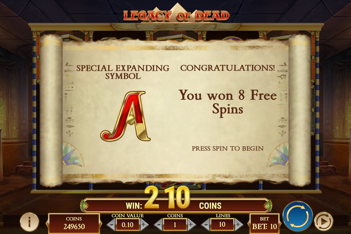 Legacy of Dead – the 8 free spins announcement screen with the selected expanding symbol (A)
