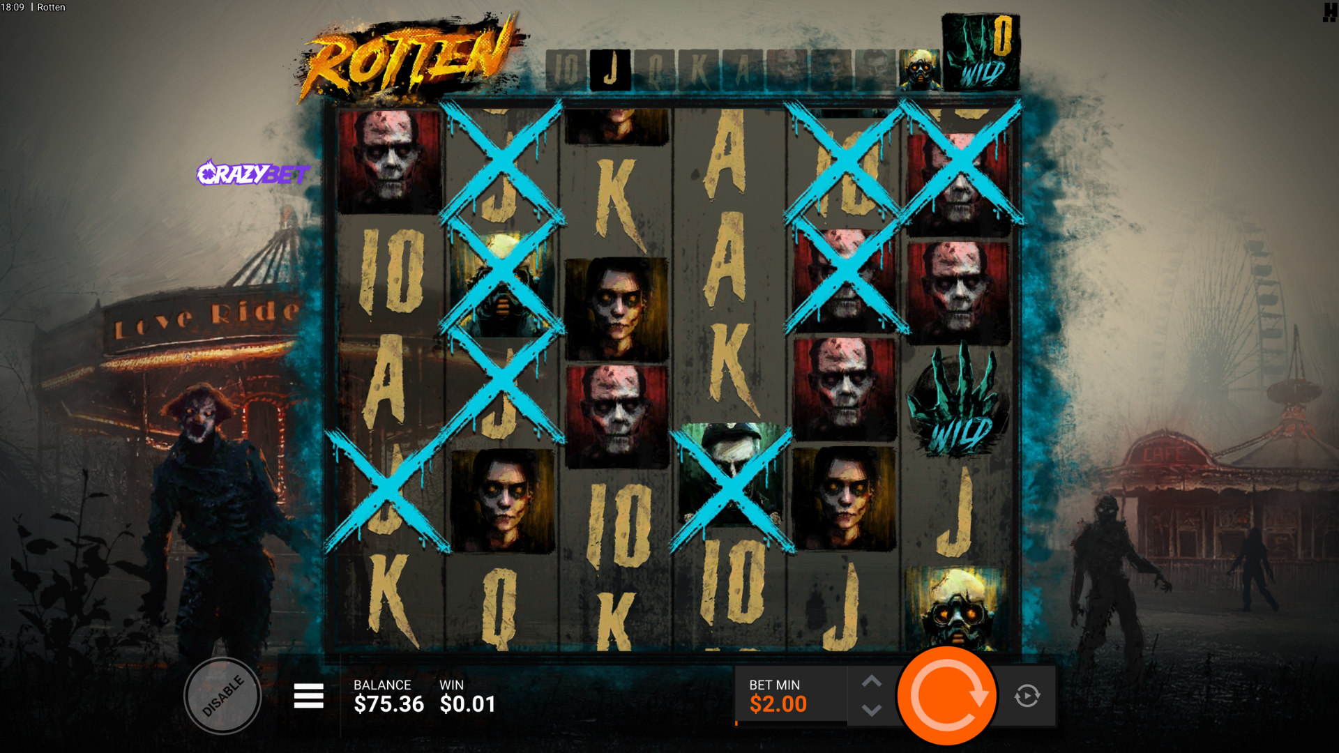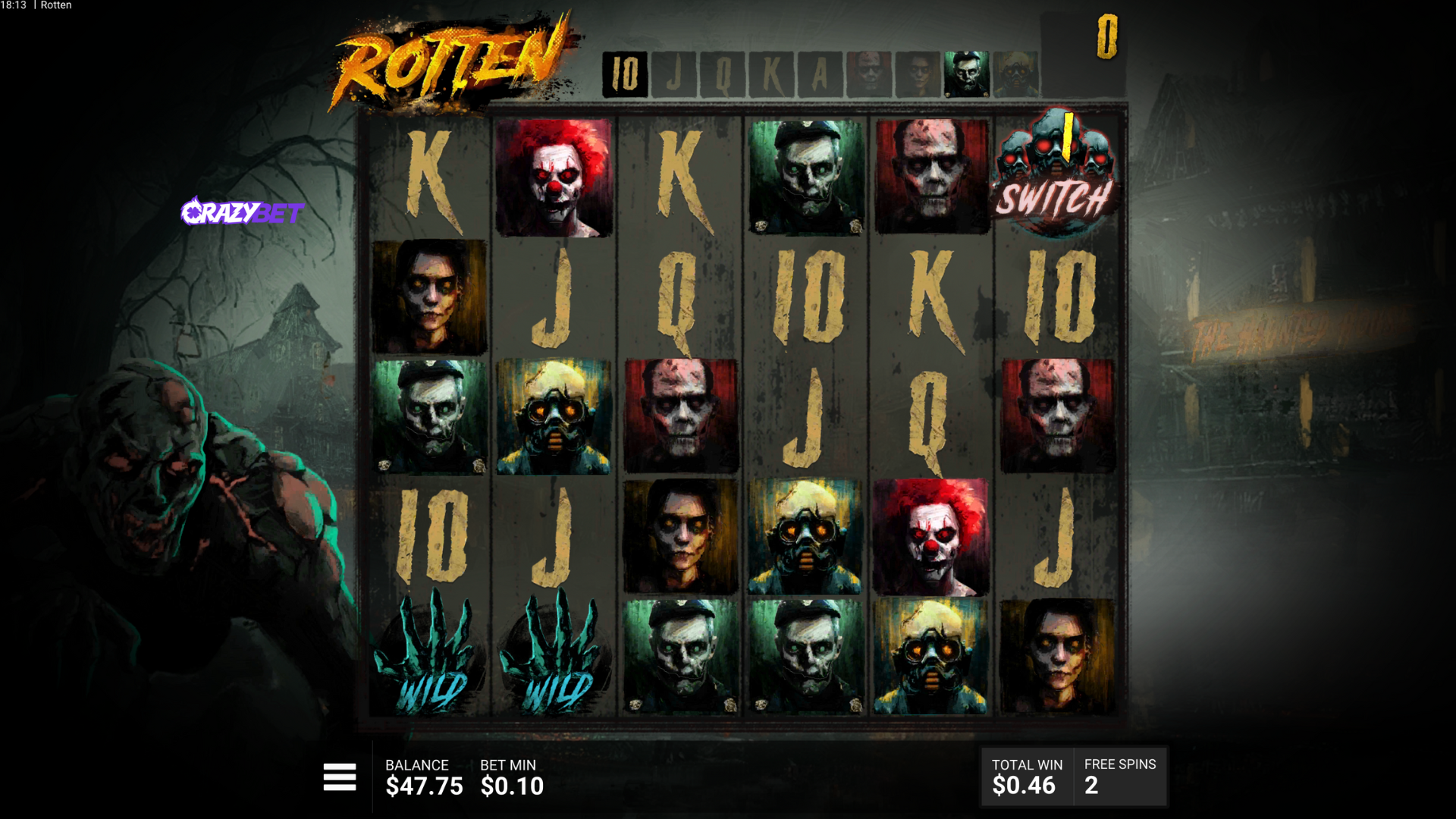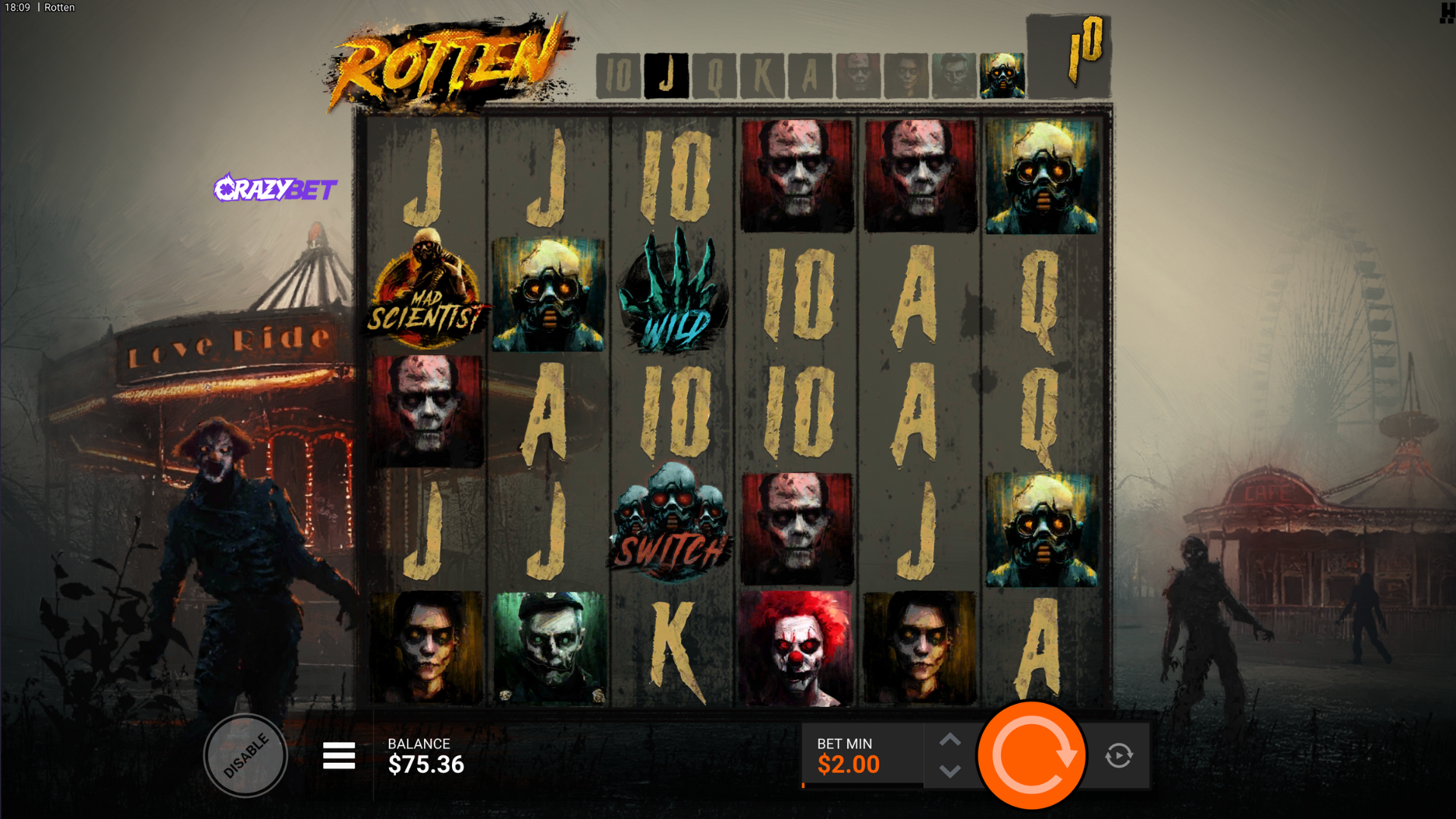 Rotten’s 6×5 grid on CrazyBet at a $2 bet: premium symbols (soldiers, masks, clown) with the “Mad Scientist” scatter sitting in the centre. Post-apocalyptic carnival backdrop, showing the base game layout before the SwitchSpins kick in.