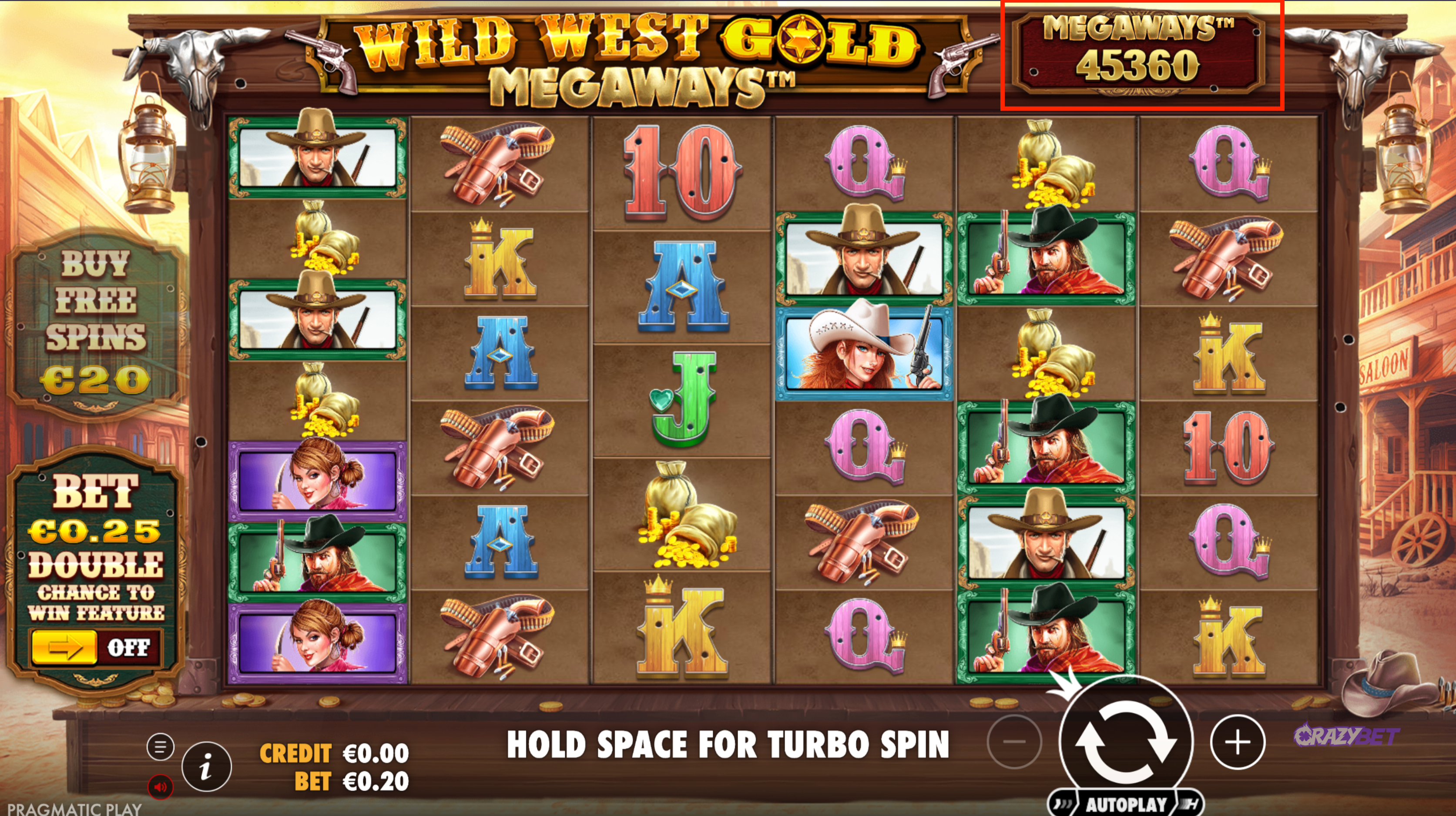 The Ante Bet is a staple feature in Pragmatic Play titles, and Wild West Gold Megaways is no exception. By activating this option, your stake increases by 25%, but you effectively double your chances of triggering the free spins.